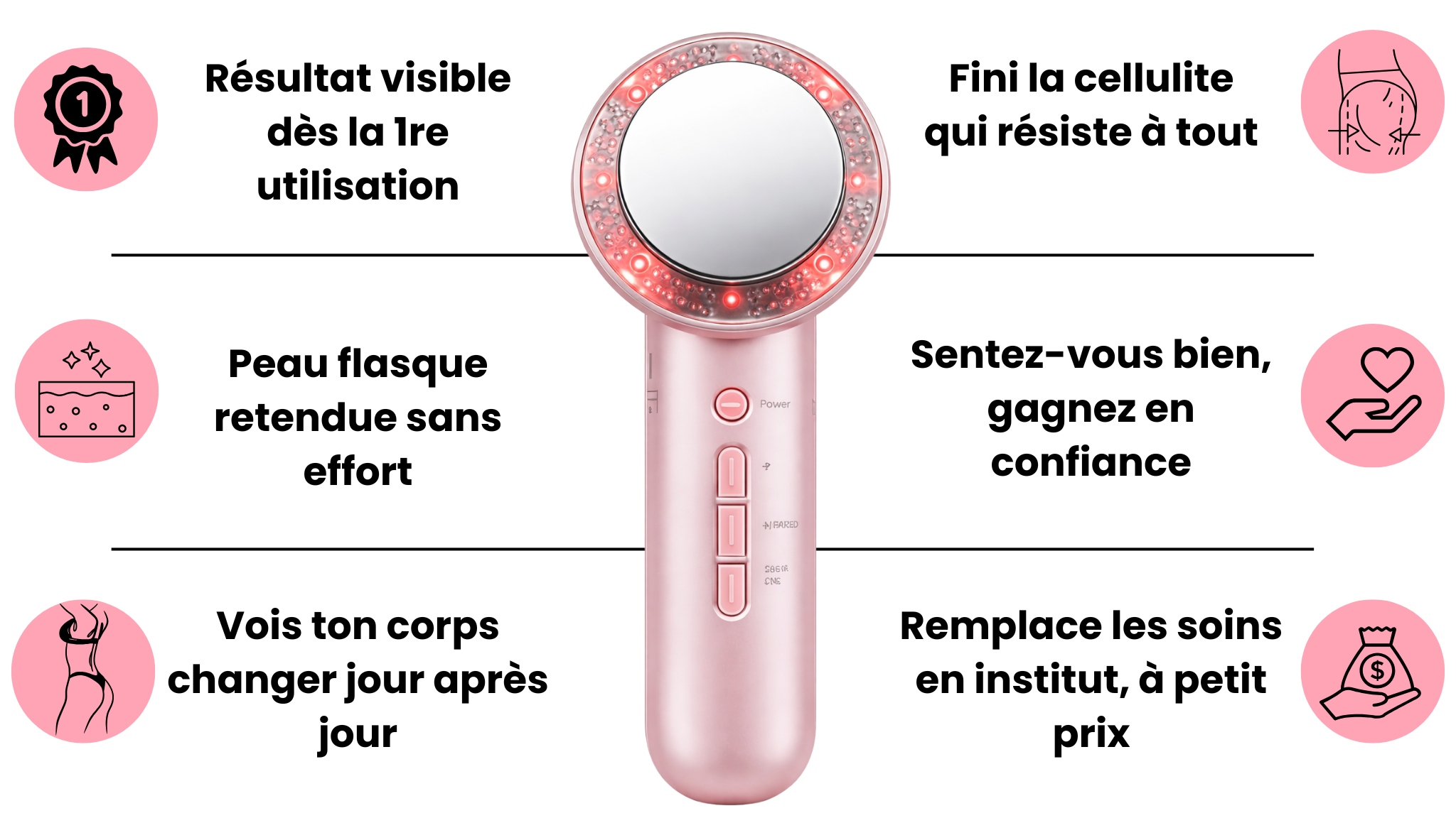 Sa combinaison d’ultrasons, d’EMS et d’infrarouges est conçue pour améliorer l’aspect de la peau, favoriser la micro-circulation et soutenir la fermeté sur des zones comme les cuisses, les bras ou l’abdomen.